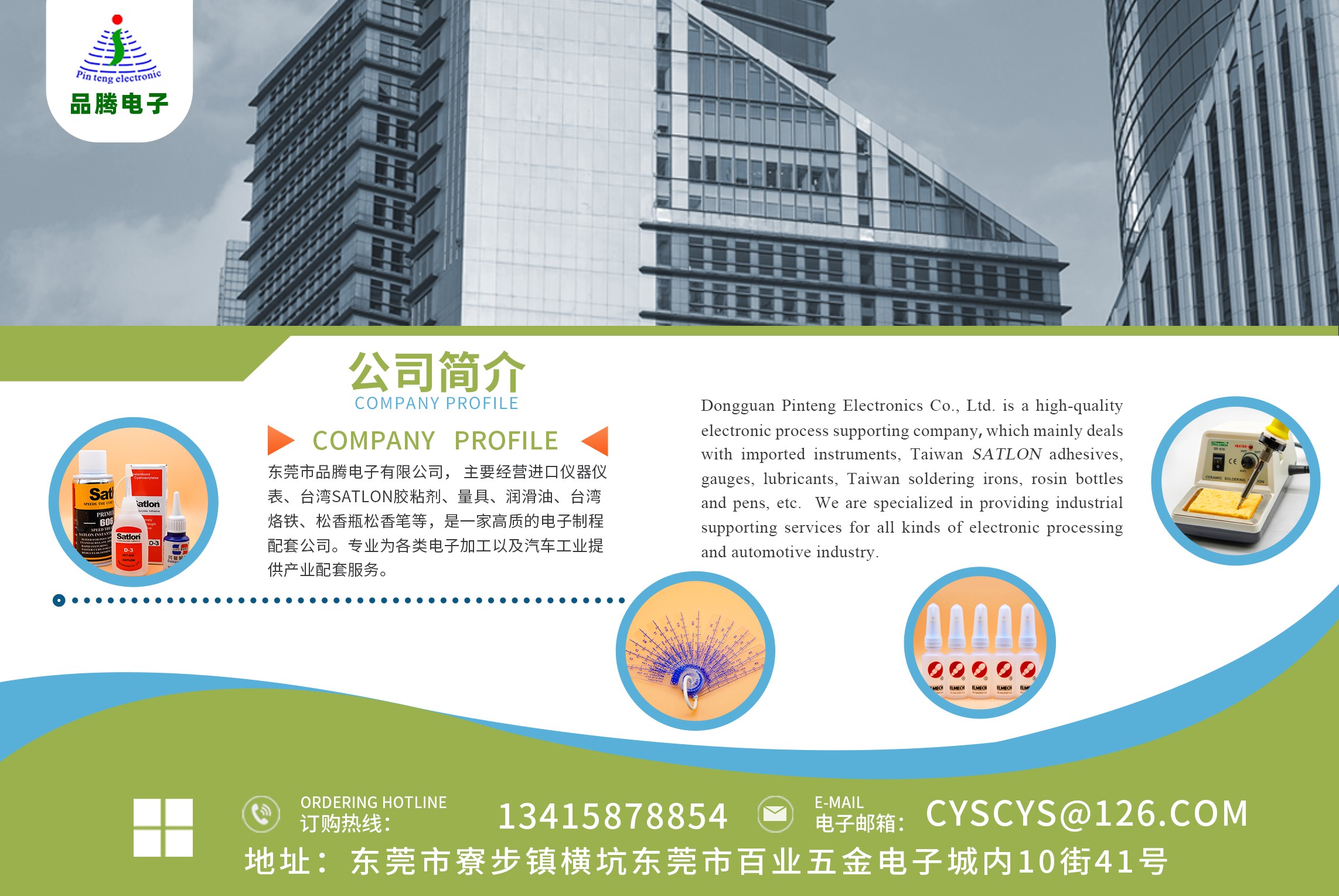 東莞市品騰電子有限公司, 主要經營進口儀器儀表、臺灣Satlon膠粘劑、量具、潤滑油、臺灣烙鐵、松香瓶松香筆等,是一家高質的電子制程配套公司。專業為各類電子加工業以及汽車工業提供產業配套服務。